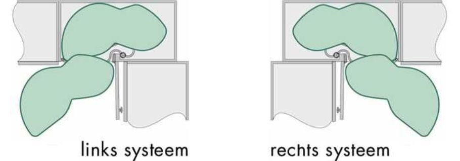 U kunt de Le Mans 2 als links en rechts systeem bestellen. Bij een links systeem zwenken de plateaus naar de linkerkant van de hoekkast, bij een rechts Le Mans 2 systeem draait deze naar de rechterkant van de deuropening.