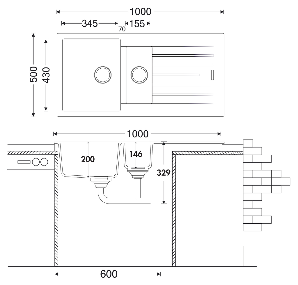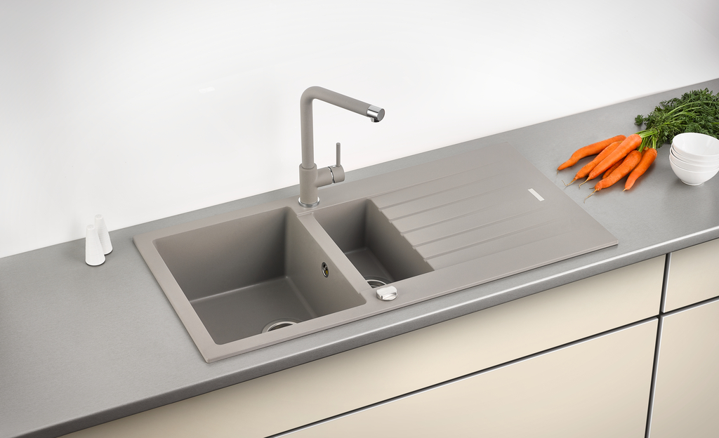 Inbouw-spoelunit. Composiet, met afdruppelvlak und restenbekken, reversibel. 3½” korfventiel met draaiwaste-garnituur, verchroomd. Restenbekken sluitbaar.