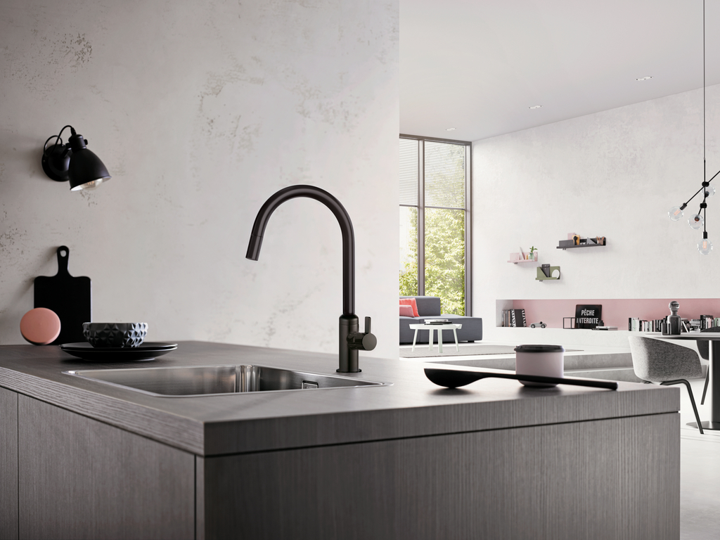 Eengreepsmengkraan. Met zwenk-/uittrekbare uitloop, zijdelingse hendel, keramisch binnenwerk en laminaire straalregelaar.