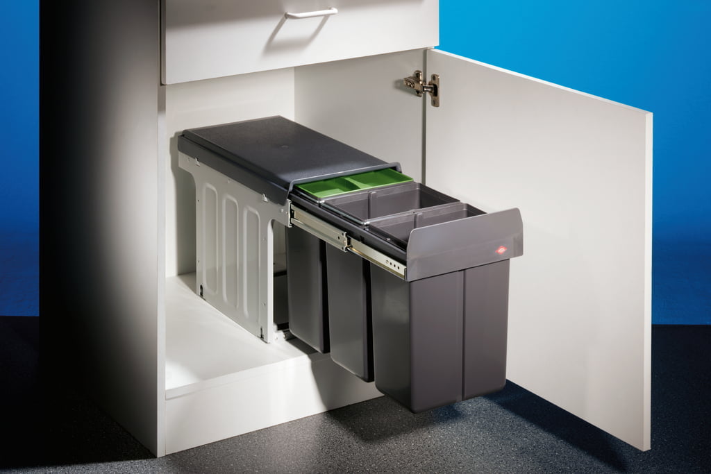 Inhoud: 24 (3×8) liter, techniek: volledig uittrekbaar, onderstel/geleiding: zilver, volledig deksel: antraciet, montage: kastbodem, met slechts 320 mm inbouwhoogte de ideale ruimtebesparing