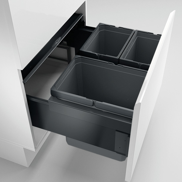 Met uittrekbaar compleet deksel. — diepte van de geleidingrail 470 mm — afvalvolume 30,5 (1 x 15,5/2 x 7,5) liter — techniek: volledig uittrekbaar — montage: kastwand en frontpaneel — met softintreksysteem en demping — inbouwdiepte 320 mm