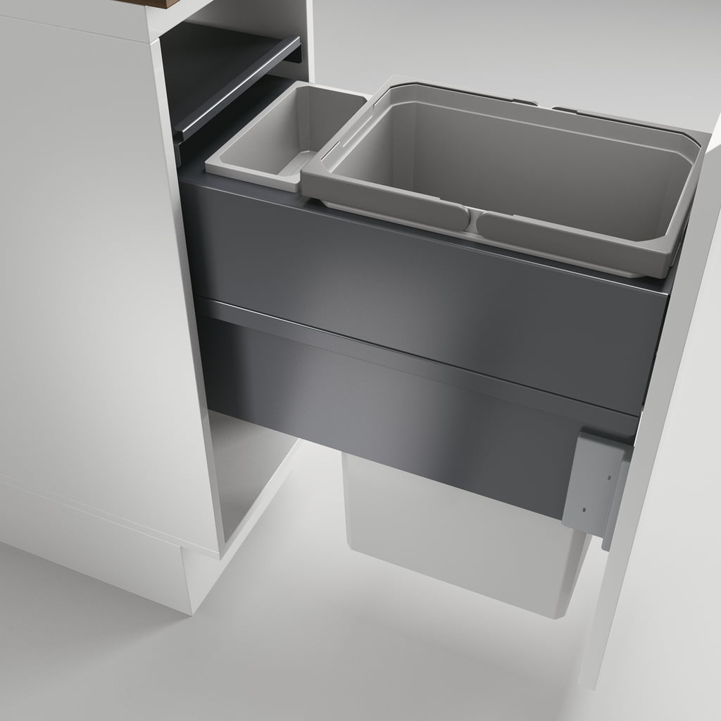 Veel consumenten zijn tegenwoordig op zoek naar afvalsystemen die ook het scheiden van afval mogelijk maken. Naber Cox Clan® is dan ook een zeer goede oplossing. Het kastbrede, metalen deksel bedekt de afvalemmers als de lade gesloten is.