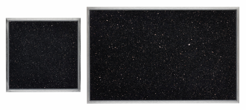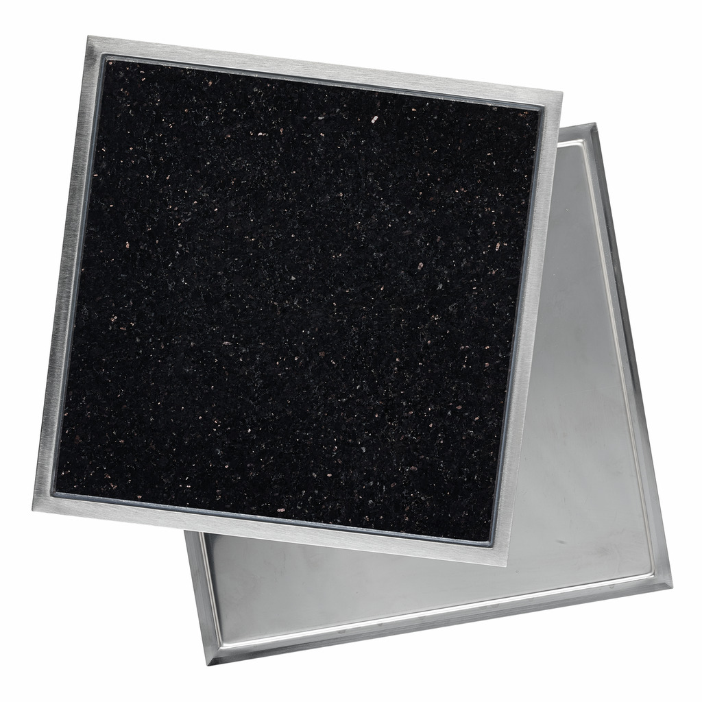 Granietveld. — maten 250 x 250 mm (incl. roestvrijstalen bad) — uitzaagmaten 236 x 236 mm — inbouwdiepte 13 mm