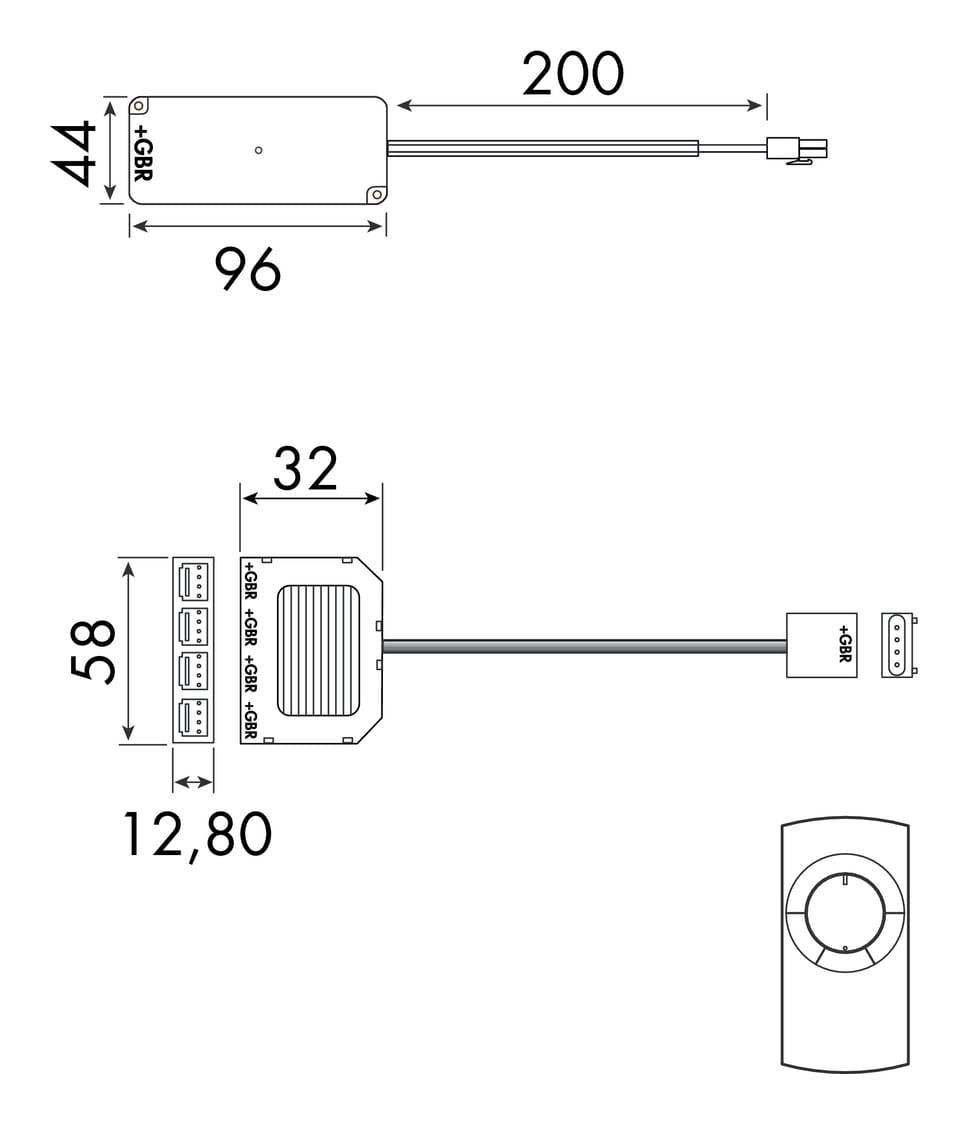 Voor individuele kleurbesturing. Met ontvanger en 4voudige verdeler.