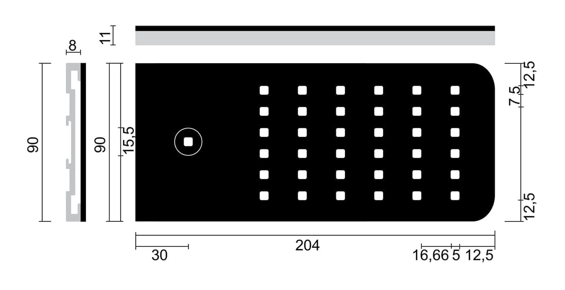 Onderbouwlamp. Kast van aluminium, roestvrij staalkleurig of wit, 36 LED’s, clipbevestiging.