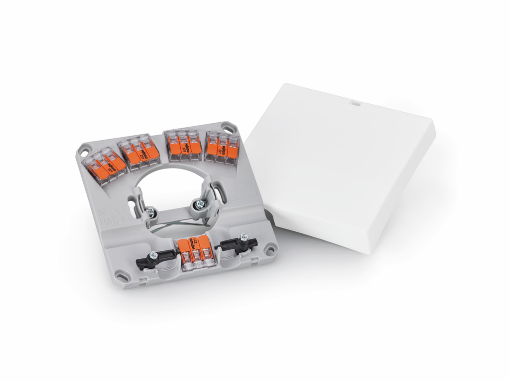 Voor op- en inbouw. — 16 A/V400 V — schroefloze klempunten tot 6 mm² — voor 55 mm wanddoos, hoogte 12 mm — zwenkbare trekontlasting — dubbele kabeluitgang (5 x 2 mm², 3 x 4 mm²) — met snapdeksel