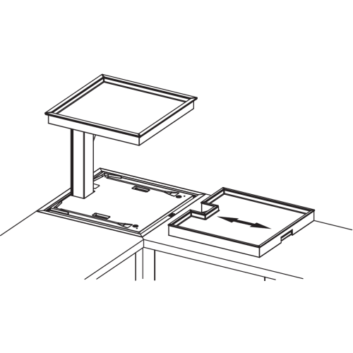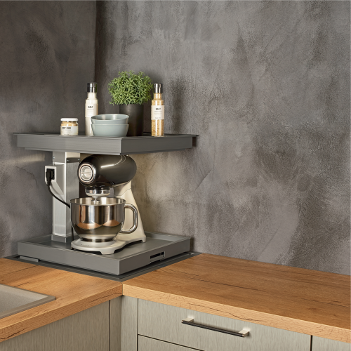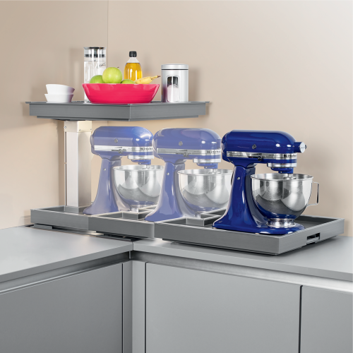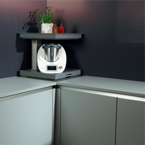 Nadat de bovenste plateau is neergelaten tot het niveau van het werkblad, worden de objecten op de onderste plateau verborgen in de corpus.