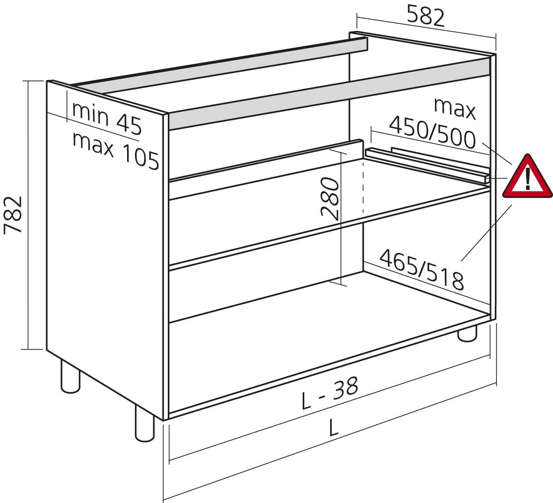 Buitendiepte: 580 mm (achterwand op 515mm vanaf voorkant kast)