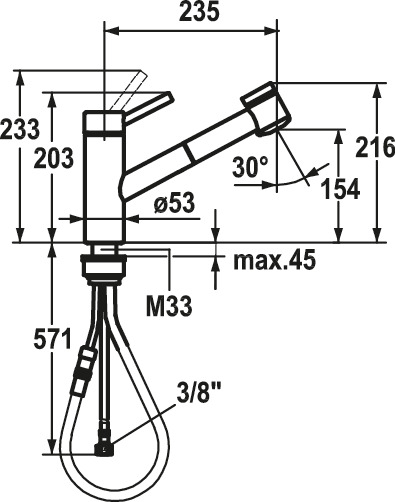 Eengreepsmengkraan. Met zwenk-/uittrekbare (metaal) slangdouche (metaal, straal/douche omschakelbaar) en keramisch binnenwerk. — zwenkbereik 130° — boor Ø 35 mm