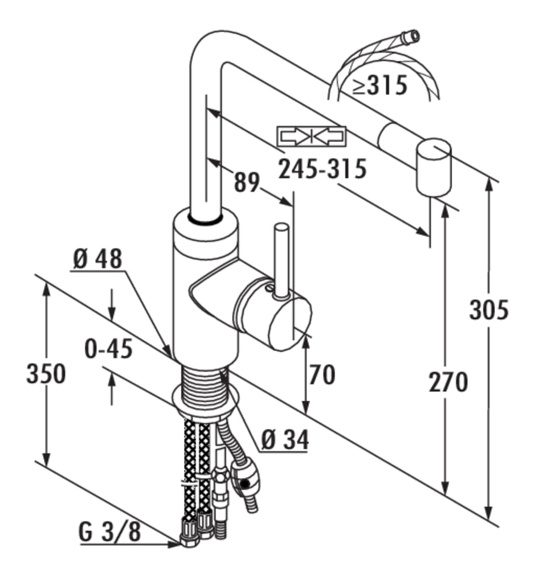 Met zwenk-/uittrekbare telescoop-uitloop, zijdelingse hendel, keramisch binnenwerk, laminaire straalregelaar en snelkoppeling, zwenkbereik 220°, boorgat ⌀ 35 mm
