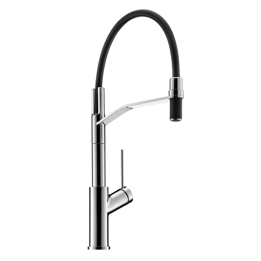 Eéngreepsmengkraan. Met zwenkbare uitloop, zijdelingse hendel en keramisch binnenwerk. Met zwarte siliconenslang en 1-straal-handdouche (metaal).