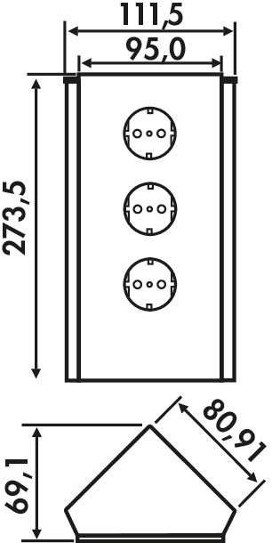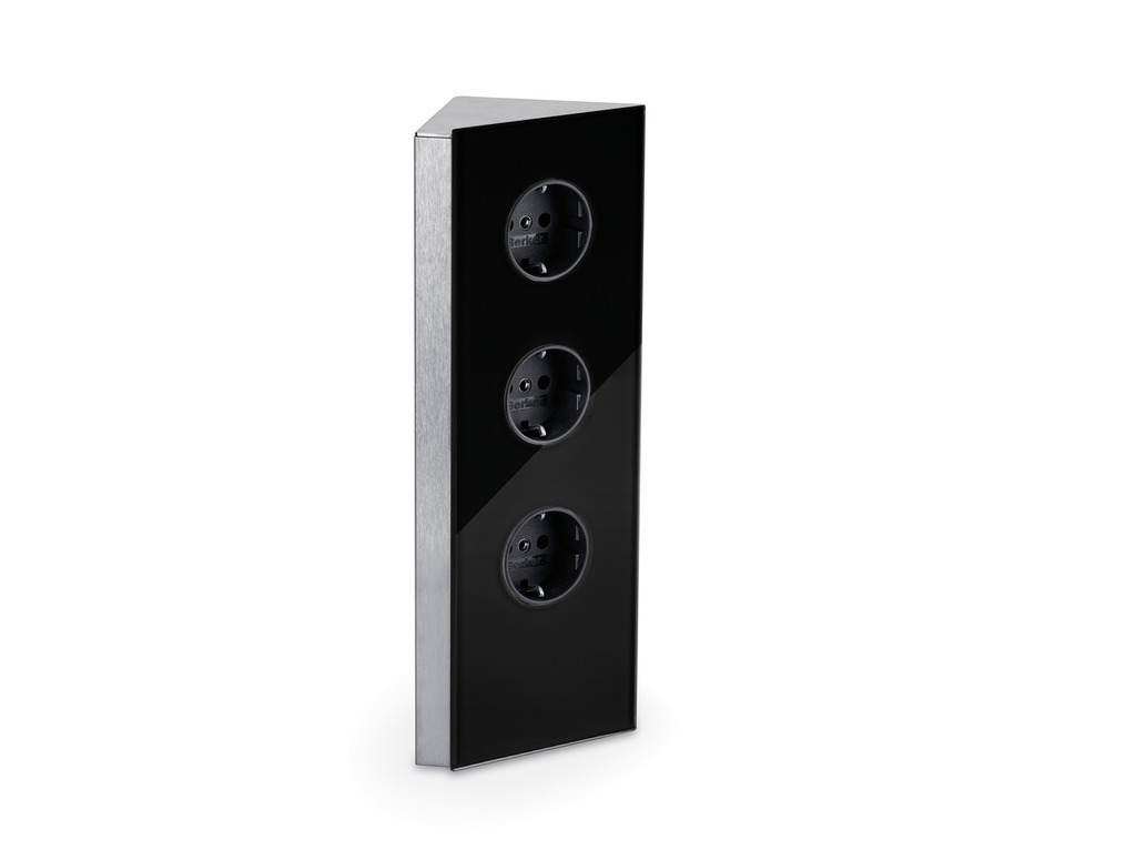 Hoekvormig stopcontactelement, 3-voudig. Frontzijde in bedrukt en krasbestendig glas, voor 90° hoek. — roestvrijstalen kast — 230 V/16 A — 273,5 x 80,91 x 80,91 mm (H x B x D) — 2000 mm netsnoer, veiligheidsstekker los bijgevoegd — kabeluitlaat achteraan
