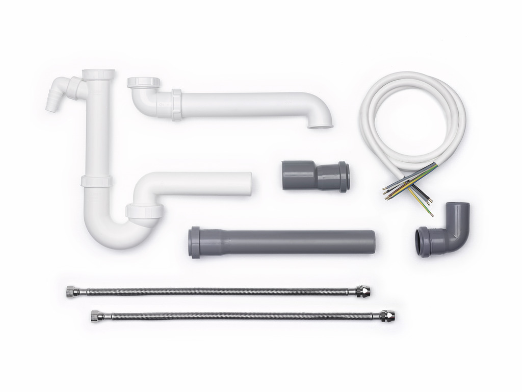 Bestaande uit: — 1 x kogelsifon DN 40 (1051011) — 1 x ruimtebesparende verbinding (1051017) — 1 x HTB bocht, DN 40/87,5° (1053014) — 1 x HTEM afvoerbuis, DN 40, 250 mm lang (1053002) — 1 x HTR overgangsstuk, DN 40/50 (1053031) — 2 x roestvrij stalen slangen met wartelmoer (5031028) — 1 x aansluitkabel, 5 x 2,5 mm², 2000 mm lang (7012004)Bij een afname van 20 sets kunnen deze ook individueel worden samengesteld.