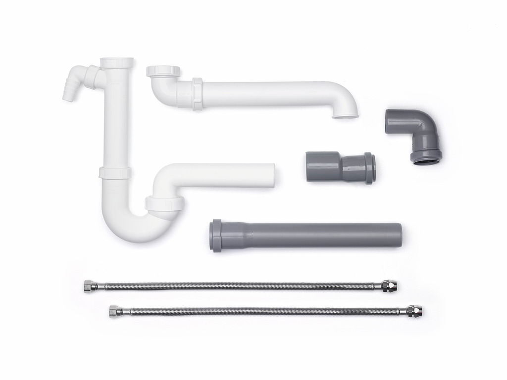 Bestaande uit: — 1 x kogelsifon DN 40 (1051011) — 1 x ruimtebesparende verbinding (1051017) — 1 x HTB bocht, DN 40/87,5° (1053014) — 1 x HTEM afvoerbuis, DN 40, 250 mm lang (1053002) — 1 x HTR overgangsstuk, DN 40/50 (1053031) — 2 x roestvrij stalen slangen met wartelmoer (5031028)Bij een afname van 20 sets kunnen deze ook individueel worden samengesteld.