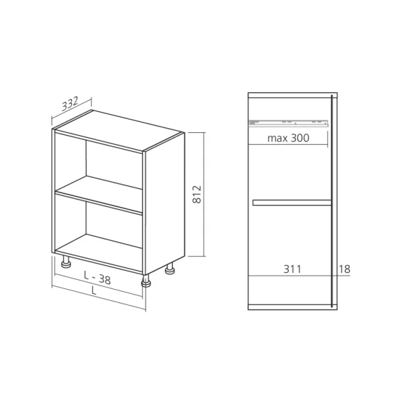 Onderkast met beperkte diepte zonder front voor zelfbouw keukens en kasten.