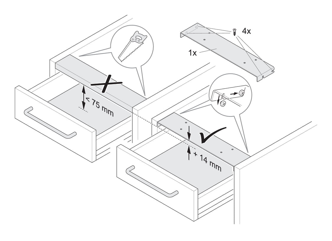 Passend voor alle inbouwsnijmachines en inbouwtoasters. De metalen travers zijn vereist, wanneer de vrije inbouwhoogte niet volstaat voor de montage, bijvoorbeeld bij onderbouwgeleidingen of gedeeltelijk bij greeploze keukens. Wanneer men de standaardtravers door de dunne metalen travers vervangt, wint men gewoonlijk 14 mm vrije hoogte. Alleen geschikt voor kasten met een wanddikte van 16 mm.