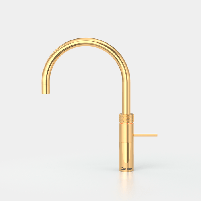 Quooker PRO3, inclusief Fusion Round koud, warm en kokend-water-kraan met kindveilige (dubbel)druk-draai bedieningsknop, 24kt verguld. Capaciteit: 3 liter 100°C, opwarmtijd: 10 minuten.