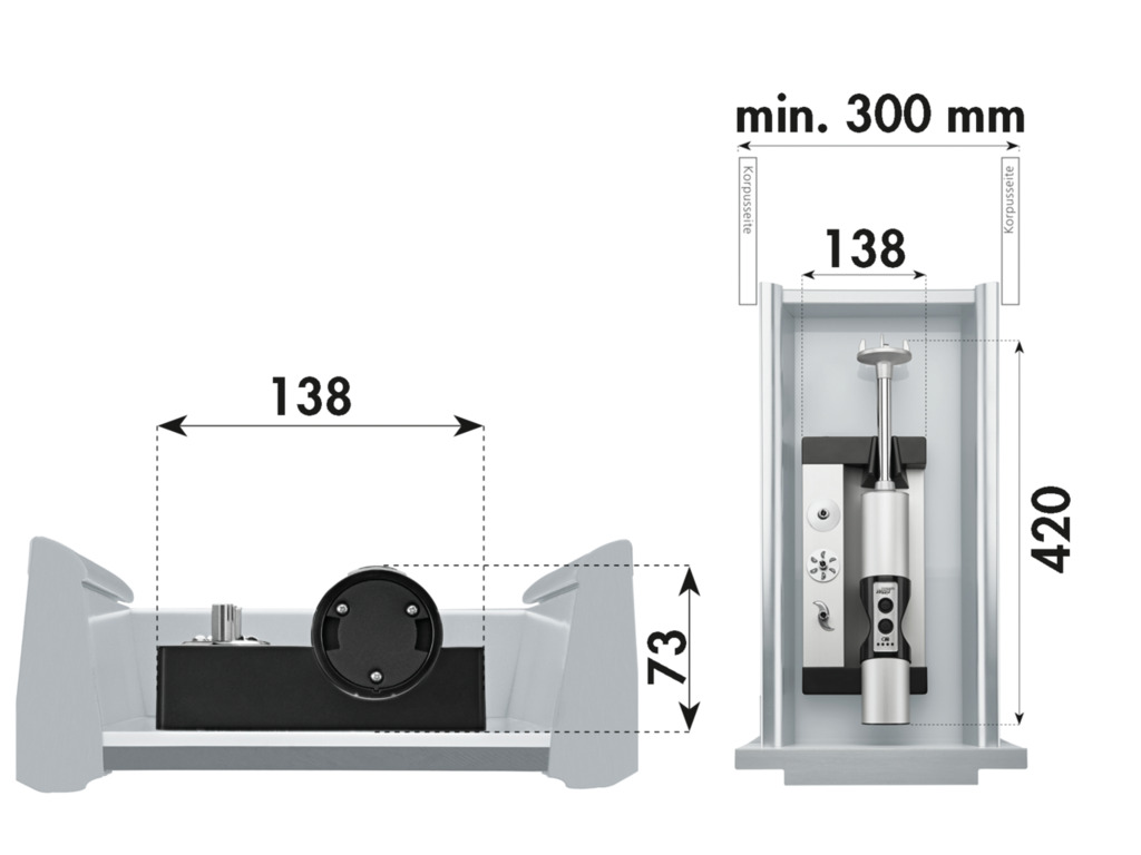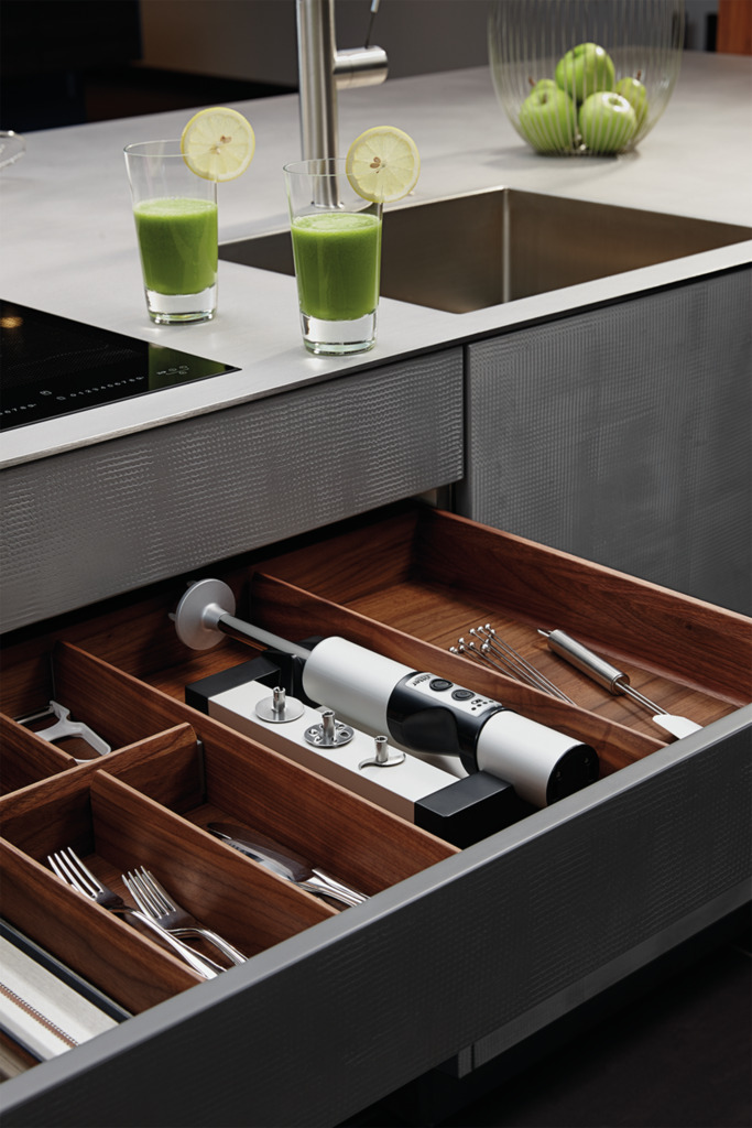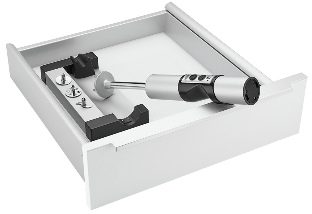 Voor installatie in laden vanaf 300 mm kastbreedte. Vereist: vrije breedte >145 mm. — draadloze, op batterijen werkende staafmixer — oplader in de lade ingebouwd — LED batterij indicator4 roestvrij stalen hulpstukken — universeel mes: standaard hulpstuk voor het pureren van de meeste voedingmiddelen — klopper: voor luchtig opgeklopt voedsel — roerschijf: voor het roeren van dikke romige gerechten — snijmes: voor het snijden van vlees en vezelig fruit en groenten — 3 snelheden: ca. 12.000 tpm, ca. 9.000 tpm, ca. 6.000 tpm. — aluminium behuizing, ergonomische plastic handgreep — veiligheid: 2 vinger-aanschakelaar — automatische veiligheidsuitschakeling in geval van overbelasting of oververhitting — plug-in voeding 120 cm voor laadstation: ingangsspanning 100–240 volt — batterij: 7,2 V, lithium-ionbatterij, 2,1 Ah — 77 x 138 x 420 mm (H x B x D), gewicht 1,4 kilogram (inclusief 400 g oplaad station) — Ø 62 mm — L 420 mm