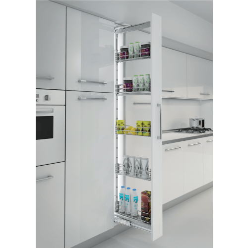 Kortom, een smal uittrekelement voor kolomkast is de perfecte oplossing voor wie op zoek is naar efficiëntie en organisatie in de keuken. Het biedt niet alleen een praktische opbergoplossing maar voegt ook een vleugje stijl toe aan je keuken. Met zijn volledig uittrekbare ontwerp, geïntegreerde demping, multifunctionele manden, indrukwekkend draagvermogen en duurzame constructie van staal, is dit uittrekelement een waardevolle investering voor elke keuken.