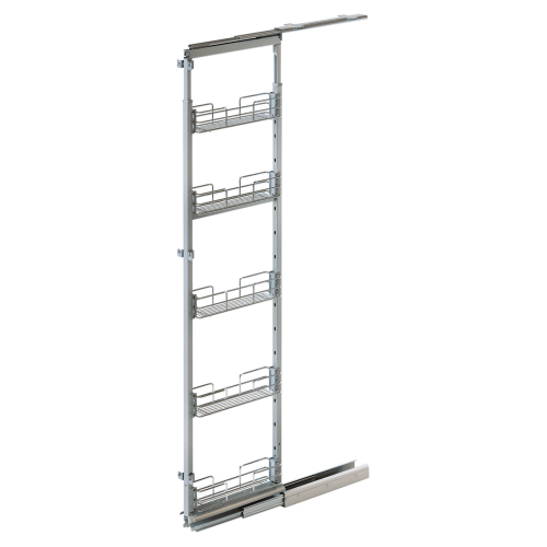 De multifunctionele aard van het Smal uittrekelement voor kolomkast komt tot uiting in de vijf manden van chroomdraad. Deze manden zijn perfect voor het opslaan van diverse keukenartikelen zoals kruiden, flessen, potten en pannen. De chroomdraad zorgt ervoor dat alles goed zichtbaar en gemakkelijk bereikbaar is. Bovendien geeft het een moderne en stijlvolle uitstraling aan je keukeninterieur.