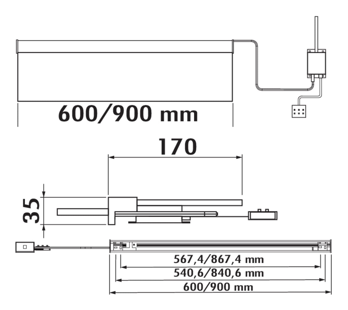 Verlicht legbord. Kast van aluminium, diepte 170 mm, aluminiumkleurig, met witte LED lampen op een afstand van 30 mm, glashelder, randen geslepen, voor paneelbevestiging. Verlicht legbord met schakelaar, 12 V, 4000 K neutraal wit, 80 lumen/watt, diepte 170 mm, de converter in niet in de kast van de lamp geâ⌀ntegreerd, 18000 mm toevoerleiding met mini stekkersysteem, kabeluitvoer achterzijde van de lamp rechts, draagvermogen ca. 5 kg bij 600 mm lengte en 7 kg bij 900 mm lengte. LED converter 3 (7061228) of 5 (7061230) moet afzonderlijk besteld worden. In de armatuur kunnen de lampen niet worden vervangen. Deze armatuur bevat ingebouwde LED-lampen met de energieklassen A++ – A op een schaal van A++ – E