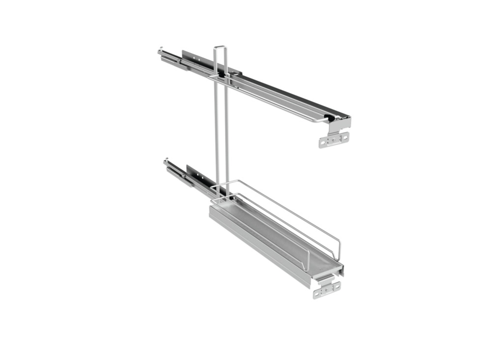 Etage-uittreksysteem met bakplaathouder en opbergelement, incl. complete uittrekgeleiding. — kastbreedte 150 mm — inbouwdiepte minstens 495 mm — inbouwhoogte minstens 530 mm — aanslag alleen maar rechts — 1 bakplaathouder en 1 opbergelement — draagvermogen max. 6 kg per opbergelement — geïntegreerde demping en zelfintreksysteem in beide geleidingen — reling zilver of antraciet — 3D-frontafstelling